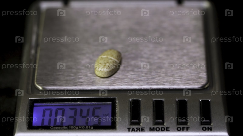 Электронные весы с планшетом на черном фоне. Лабораторные весы. Таблетки и медицинское здравоохранение, близко. Серые таблетки на электронных весах
