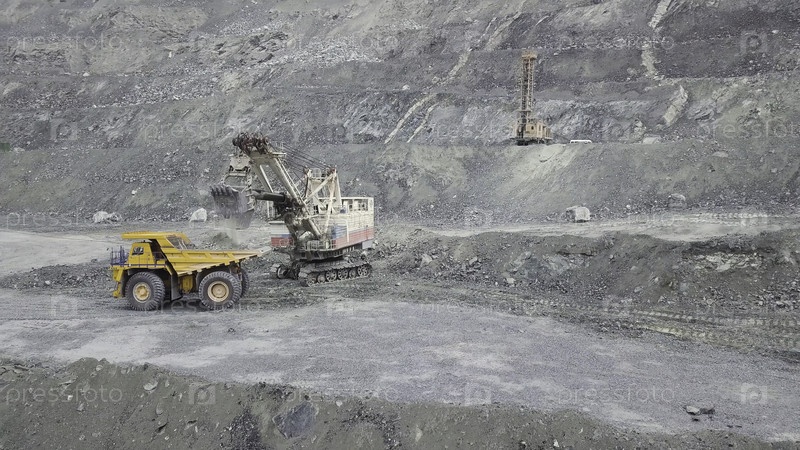 Экскаватор и буровой грузовик при погрузке каменной руды в серый карьер, горнодобывающая промышленность. Сток