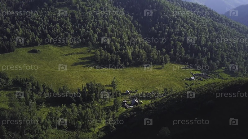 Зелёная горная долина, воздушный пейзаж. Алтай, Россия. Аэроалтайский горный ландшафт. Горный хребет за лесистыми равнинами. Альтайские горы удалены с беспилотника, вид из воздуха