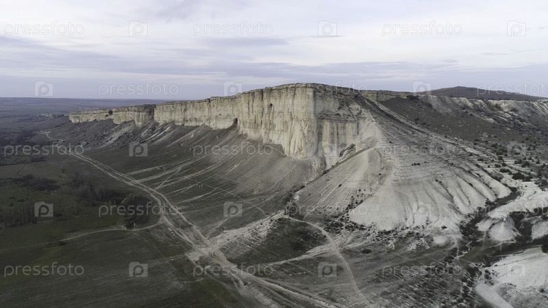 Вид с воздуха захватывающей белой скалы возле зеленой долины на фоне красивого облачного неба.Белая высокая скала рядом со зелёным травянистым полем