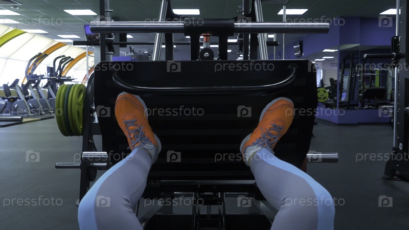 Закройте обувь здоровой молодой женщины, делающей пресс ног в тренажерном зале. Глаза здоровой молодой женщины, делающей пресс ног в тренажерном зале. Молодые красивые женщины занимаются тяжелой атлетикой в тренажерном зале. Женский пресс ног