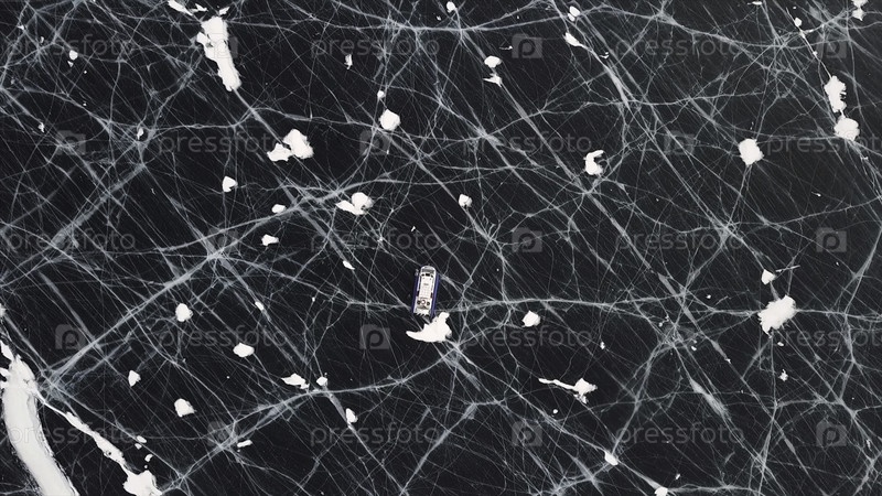Вид с воздуха автомобиля, движущегося по замерзшему удивительному озеру.Типичный лётный аппарат на прозрачной ледяной поверхности, Байкальское озеро, Сибирь, Россия