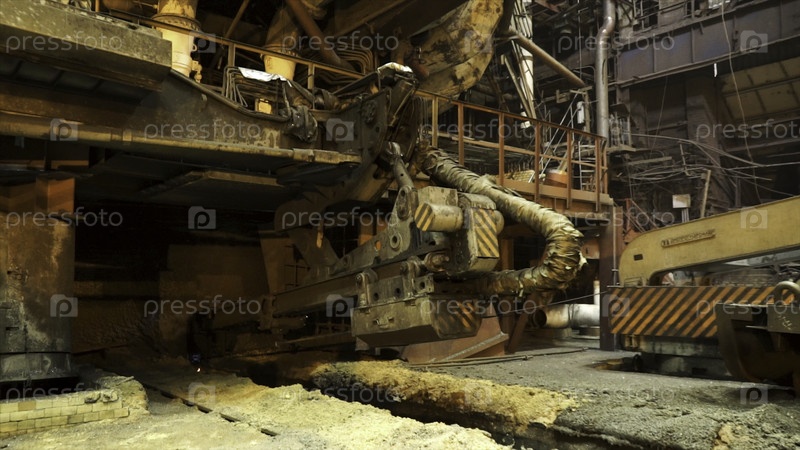 Производство стали на сталелитейном заводе, концепция тяжелой промышленности.Закрыть ведро для подачи металла в формы