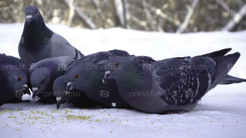 Голуби едят зерно в снегу.СМИ. Сверху голубы приходят съесть разбросанные зерна проса в снеге в парке