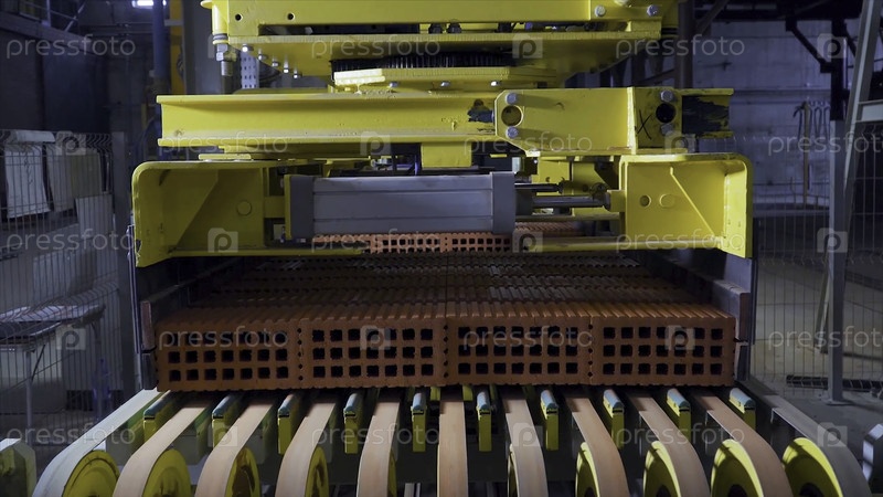 Завод по производству строительного материала с готовым кирпичом, промышленное строительство. Производство кирпичей на заводе. Рабочий процесс, крупный план. Много HD-кирпичей