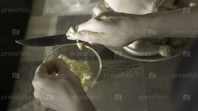 Покройте женский чеснок кухонным ножом. давай. вид сверху на руки женщин, режущих чеснок и бросающих его в глубокую стеклянную тарелку стоящую на столе, кулинарная концепция