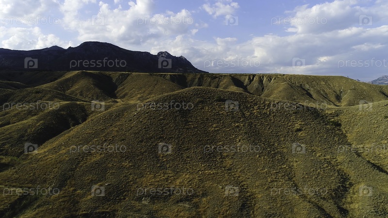 Осеннее синее небо с белыми облаками и горы с засушливой травой. стрельба. закаты солнца среди холмов, покрытых желтой сухой травой