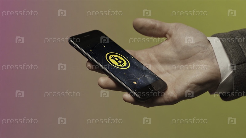 Концепция бизнеса, технологии и криптовалюты заключается в том, чтобы закрыть руку человека, держащего смартфон и носящего умные часы с биткойнами на экране