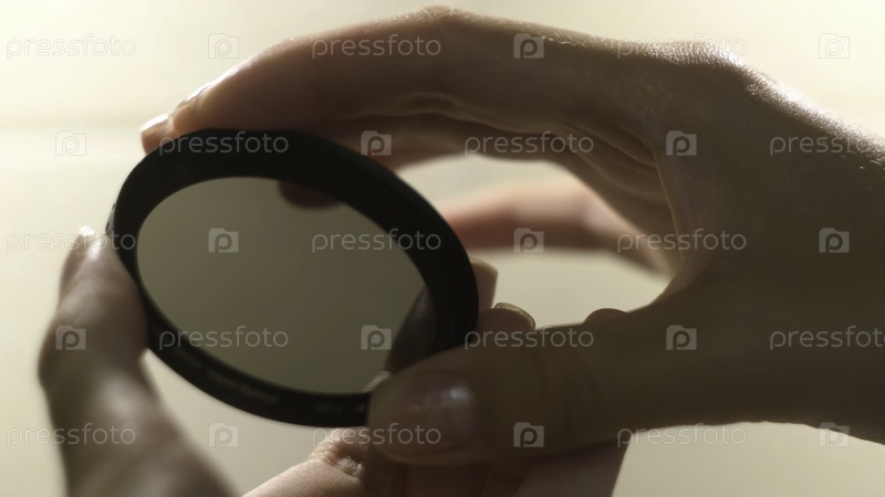 Женщина держит фильтр объектива камеры на белом фоне. Концепция. Закройте руки женщин, открывая и закрывая циркулярный фильтр объектива камеры