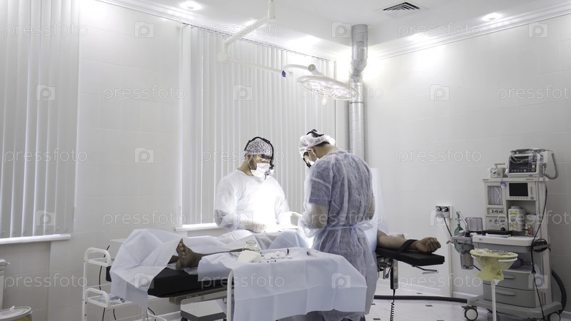 Концепция здоровья и медицины, эффект расширения времени.Два врача-мужчины в хирургических костюмах проводят операцию на мужском пациенте в операционной с помощью медсестры