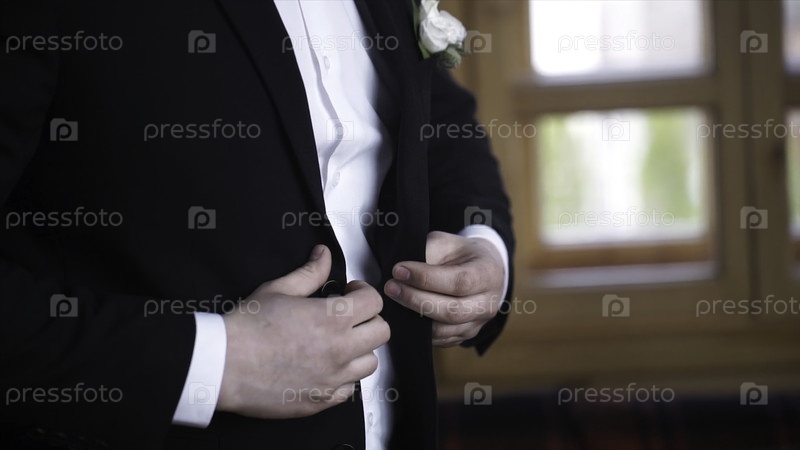 Мужчина застегнул куртку. Детали свадьбы - элегантный жених, одетый в свадебный смокинговый костюм, ожидает невесту. Бизнесмен застегнул куртку, оделся