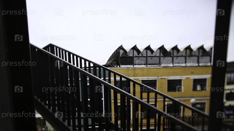 Бегство от пожара в темном переулке. Кадр. Типичные аварийные лестницы из старого здания. Пожарный выход