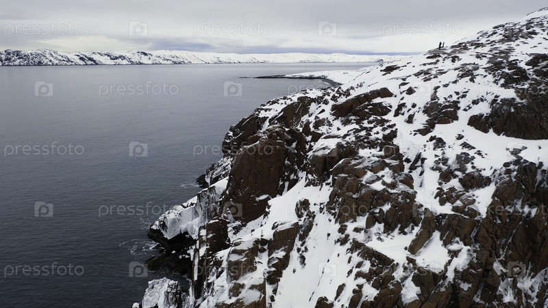 Воздух крутых скал, покрытых белым снегом и голубым морем, красота зимней природы.Летайте над красивым каменистым побережьем в зимний сезон