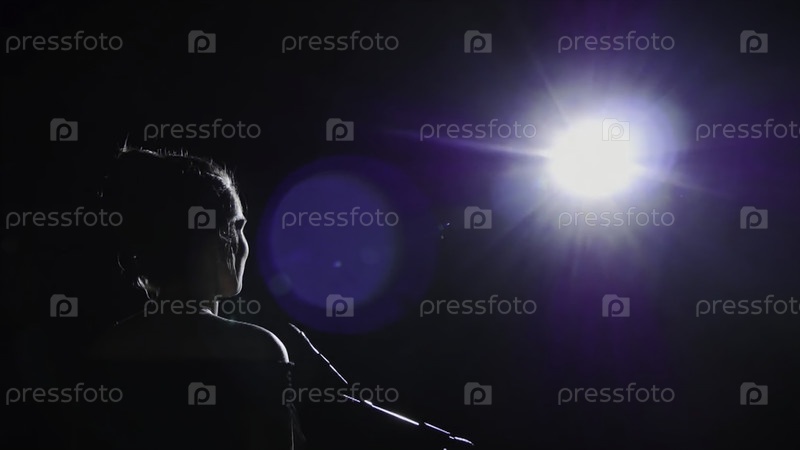 Девочка в длинном платье выступает на сцене.Девушка поёт на сцене перед прожектором.Силуэт певицы, стоящей на сцене у микрофона в ночном клубе