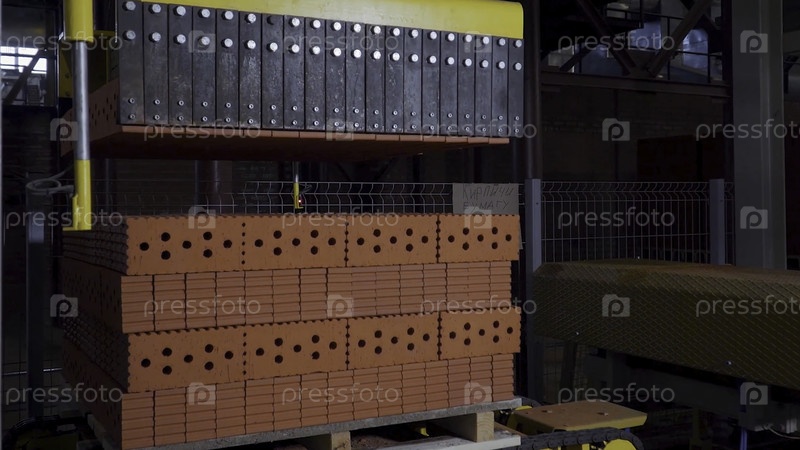 Завод по производству строительного материала с готовым кирпичом, промышленное строительство. Производство кирпичей на заводе. Рабочий процесс, крупный план. Много HD-кирпичей