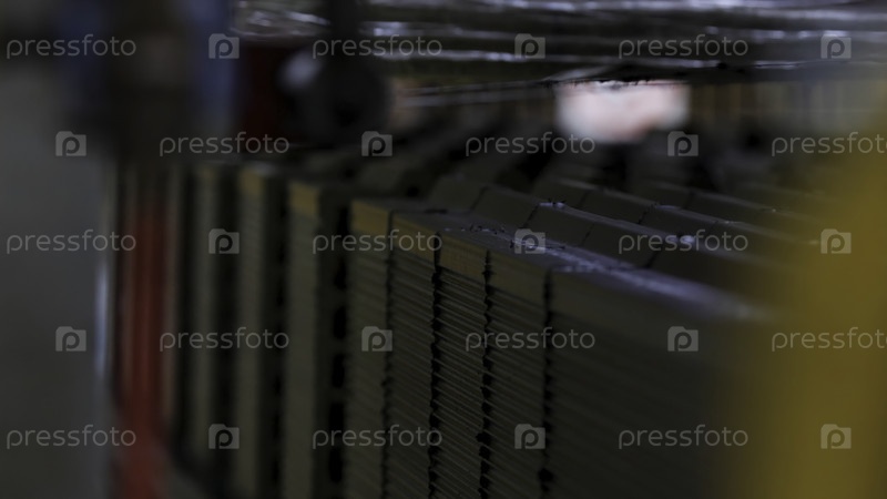 Промышленный фон с сырыми керамическими блоками, нарезанными пилой. резервные кадры. изделия из кирпича и блоков, конвейерная лента с сырыми керамическими блоками на заводе