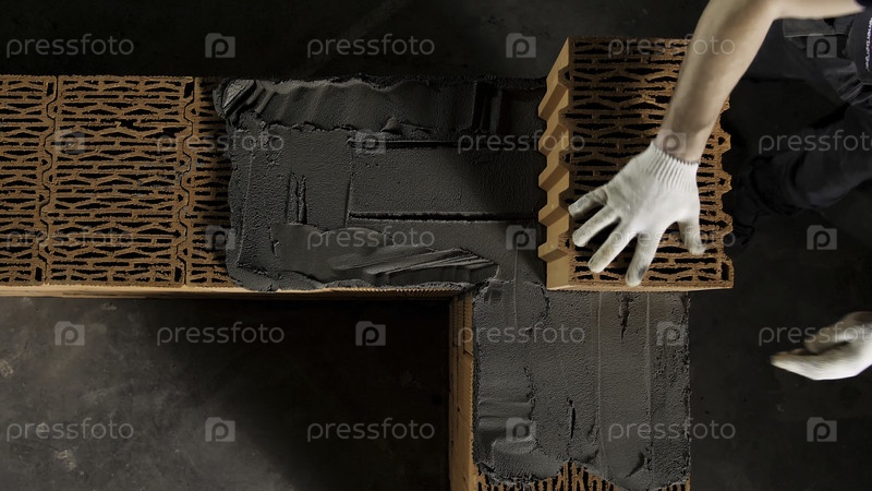 Человек строит кирпичную стену, строит кирпичный дом.Вид сверху промышленного рабочего, помещающего керамический блок в слой цемента