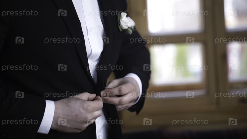 Мужчина застегнул куртку. Детали свадьбы - элегантный жених, одетый в свадебный смокинговый костюм, ожидает невесту. Бизнесмен застегнул куртку, оделся