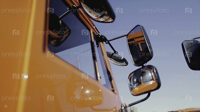 Закройте боковое зеркало и часть красного кузова грузовика на голубом фоне чистого неба. резервные кадры. новые детали грузовика, конструкционная концепция