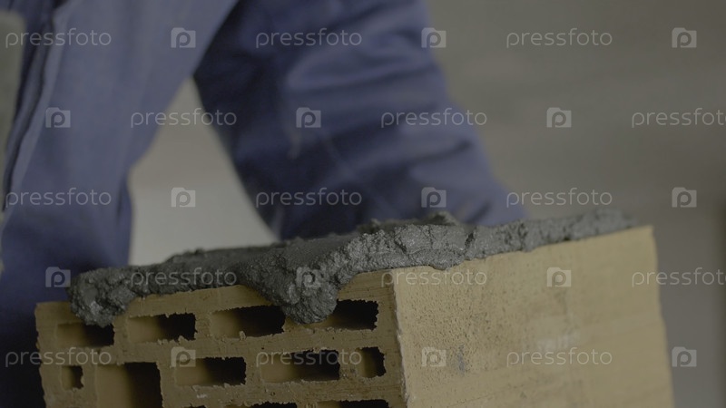 Строительство кирпичной стены.Тролл бросает цемент на кирпичи.Работник рассыпает цемент по кирпичам