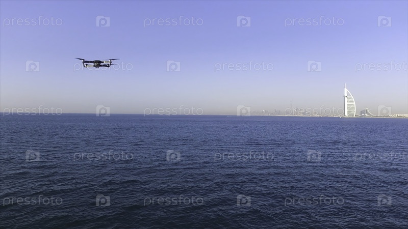 Вид с воздуха отеля Burj Al Arab, известного роскошного курорта в Дубае на фоне голубого неба. Сток. квадрокоптер или дрон летает на фоне удивительного морского пейзажа