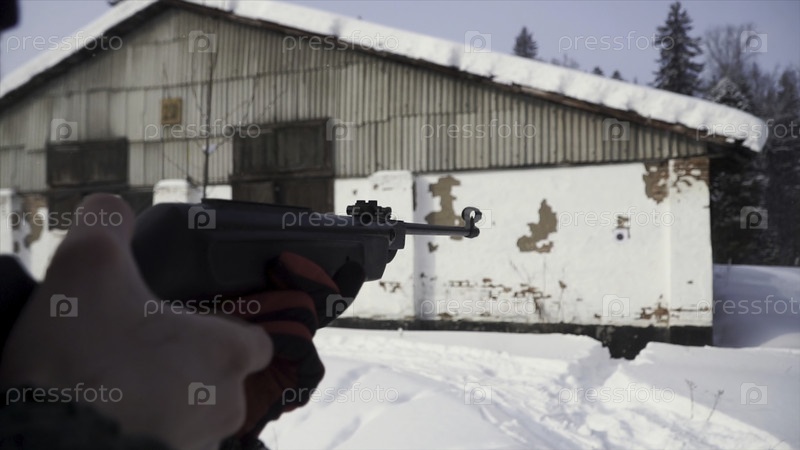Человек, направляющий пулемет на цель, практикует свою мишень зимой. Клип. Стрелок в камуфляже целится в цель из винтовки с оптическим прицелом, фокусируется на оружии