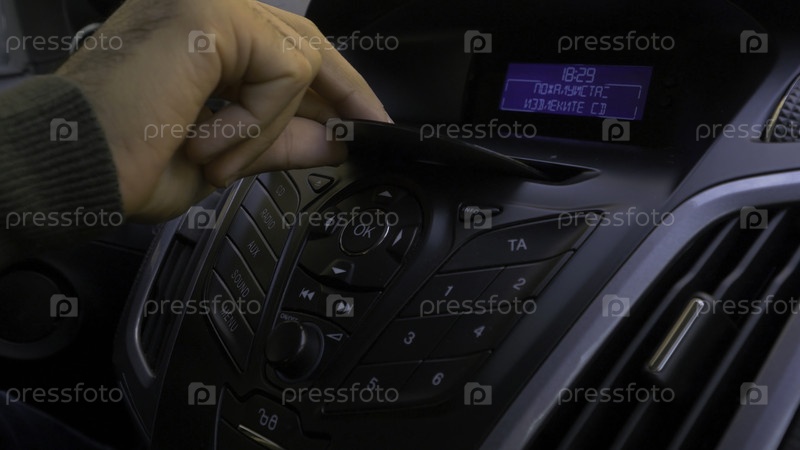 Человеческая рука помещает диск в автоплеер. Кнопка управления для CD-плеера в машине. Рука ставит диск в HD радио автомобиле