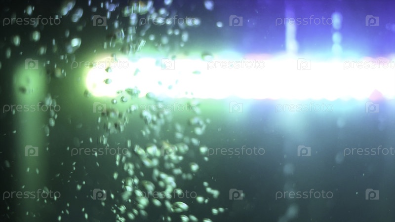 Боковой вид кипящей воды с зеленой лампой на заднем плане. Рамка. Воздушные пузыри под водой в пустом аквариуме
