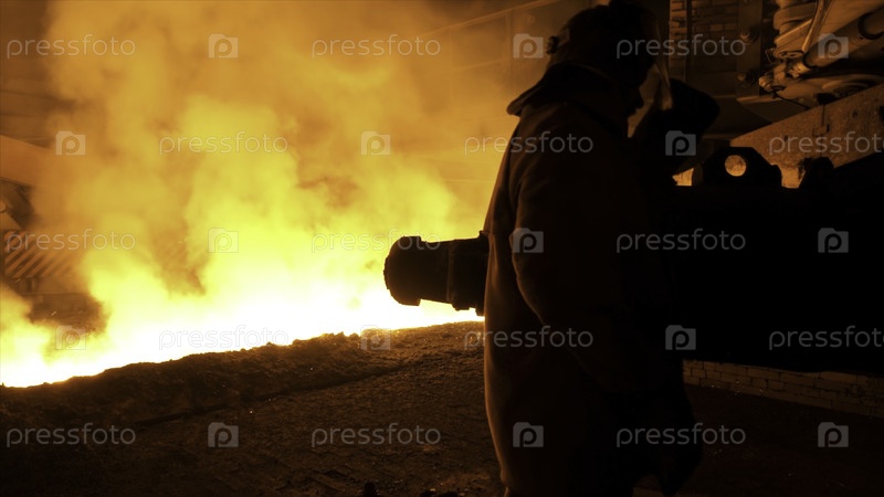 Человеческий работник в специальной защитной одежде, стоящий рядом с расплавленной сталью со искрами и паром - концепция тяжелой промышленности