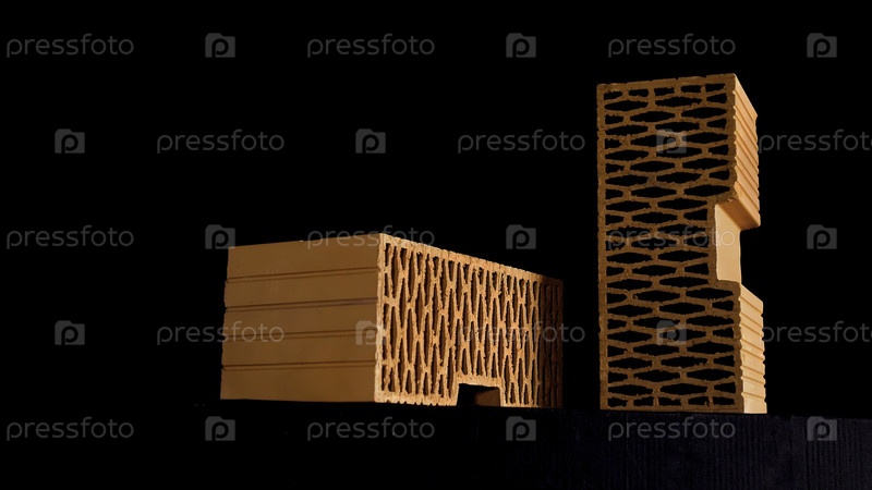 Покрыть оранжевые перфорированные кирпичи круглыми отверстиями, движущимися в изоляции на черном фоне. резервная запись. Материалы для строительства нового кирпичного дома