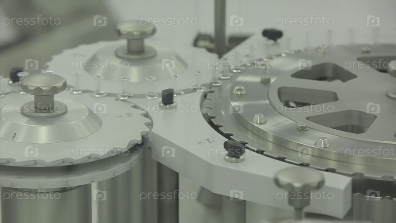 Фармацевтическая промышленность. Производственная линия машинного конвейера со стеклянными бутылками ампул на заводе. Таблетки или капсулы счетчика на фабрике. Наука и медицина