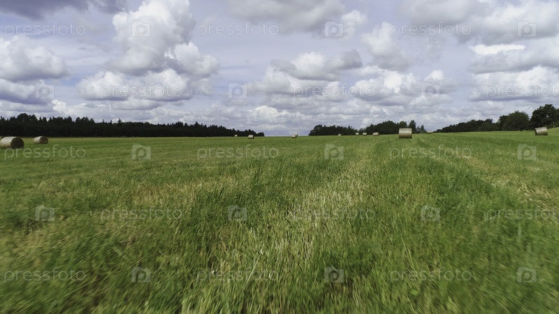 Летний пейзаж лугов, вырубленных во время сбора урожая.Сеноводы сушат под солнцем, готовят корм для животных, сельский экологический регион
