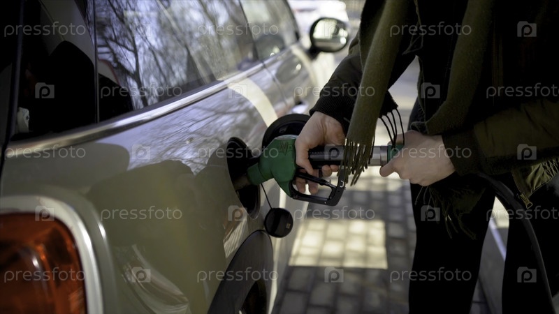 Мужчина вставляет шланг в машину автозаправки. Продолжайте. Человек нервно и быстро заправляет автомобиль на заправочной станции. Заправка автомобиля во время длительной погони