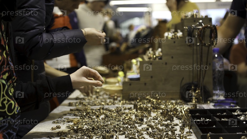 Сувенирный базар с различными статуями и подарками. Резервные кадры. Вид людей, стоящих за столом со множеством маленьких золотых фигур и выбирающих их на уличном рынке