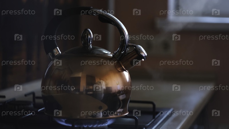 Концепция: нагреватель, светящийся под стальным полированным чайником с кипящей водой и отражением кухни на его поверхности