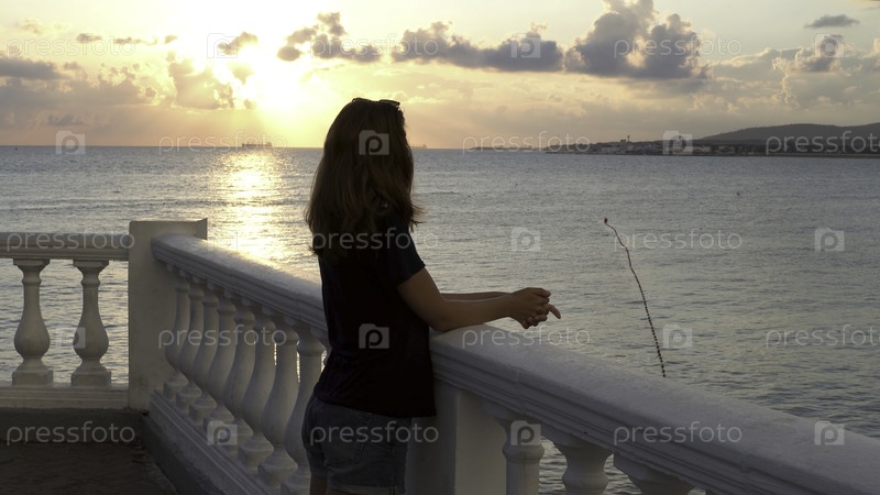 Женщина стоит на promenade у моря и смотрит на потрясающий закат солнца. одинокая молодая романтическая девушка, опирающаяся на перила. красивый морской пейзаж