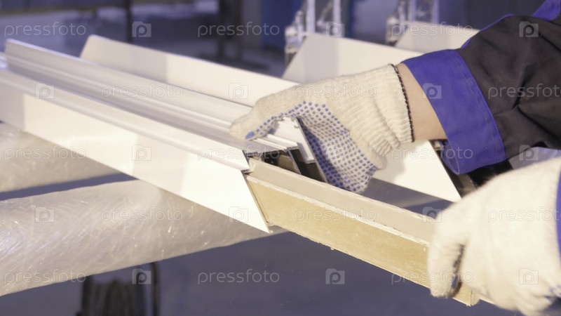 Руки рабочего, использующего силиконовую трубку для ремонта окон в помещении. Детали алюминиевого окна. Строитель устанавливает окно на рабочем месте. Обзор пожилого человека с использованием силиковой трубы для ремонта окна в комнате