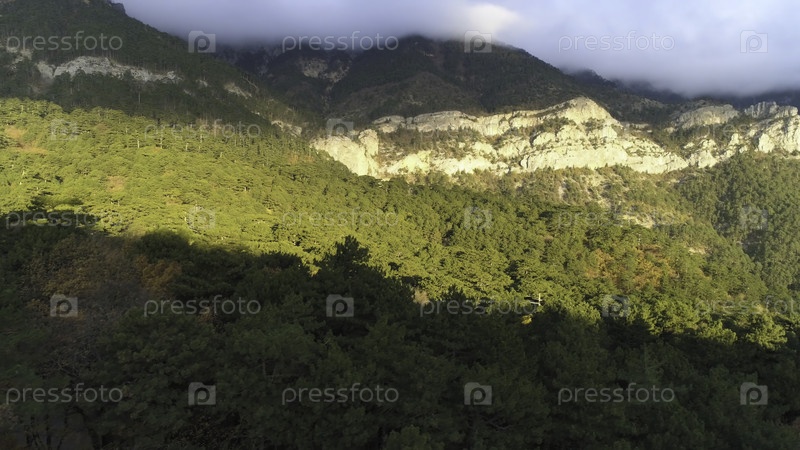 Густой туман скрывает горы и густый лес, растущий на склонах гор, красота природы