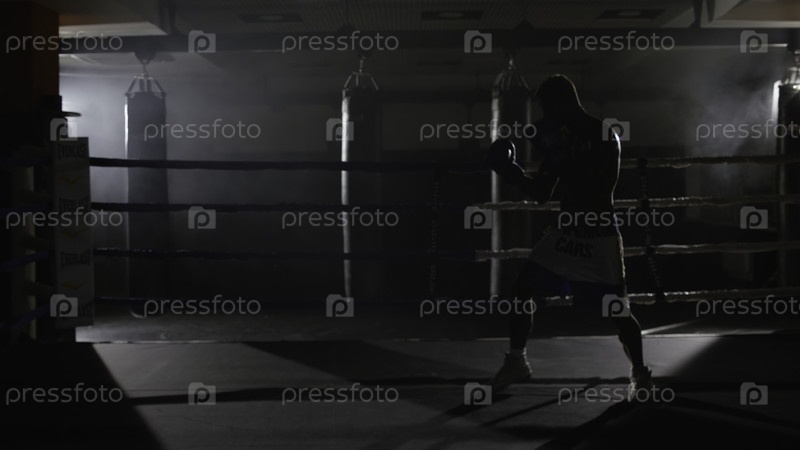 Бой теневого бокса на тренировочном ринге. Профессиональный боец. Мужской боксер в обучающей спортивной одежде, гимнастические упражнения, теневой бой на ринге, Strike testing