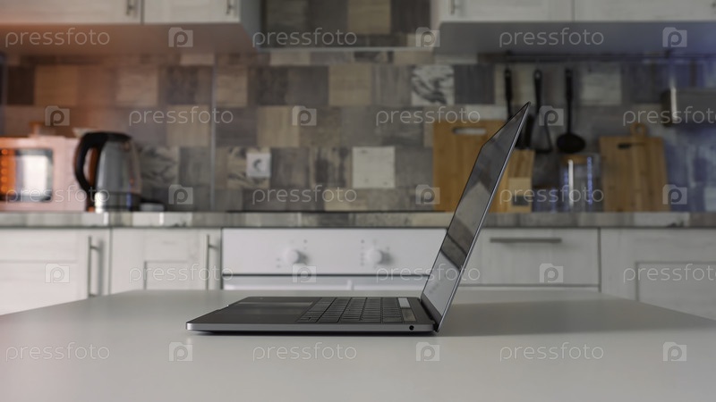Концепция работы у себя дома во время изоляции. давайте. боковой взгляд на руки мужчин показывает новый серебряный ноутбук, который стоит на белом столе в кухне