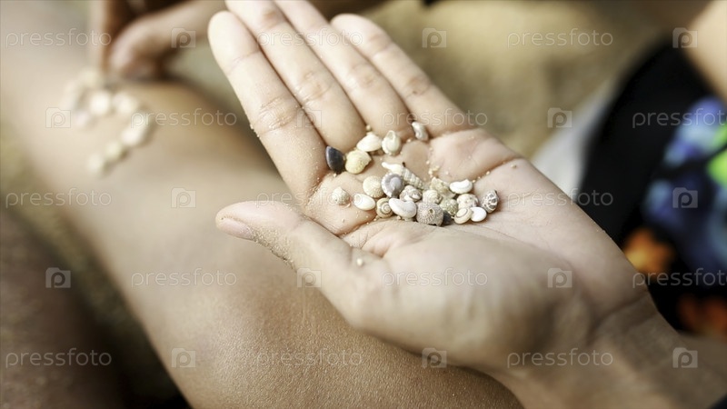 Женские руки собирают узоры ракушек и песка, близко. Видео. Девушка играет с моллюсками и песком, сидя на пляже. Закройте руки, держа много красивых ракушек