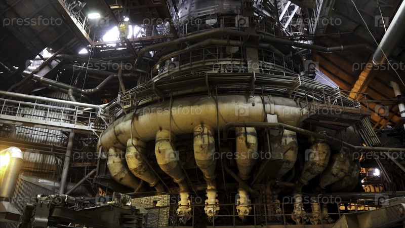Закройте высокую печь с жидкой сталью внутри, концепция тяжелой промышленности.Машины и рабочие на металлургическом заводе