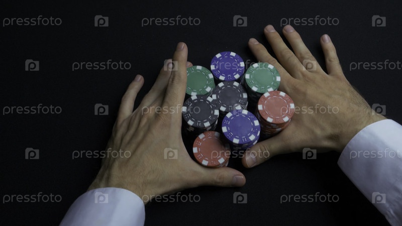 Стол с фишками и двумя руками на столе. Закрытие фишек в стаках на поверхности зеленого фелтового стола. Фишки и руки над ними на зелёном столе. дилер