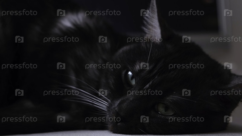 Закройте мягкого и пушистого черно-белого кота, который засыпает. Концепция. Домашний кот с большими зелеными глазами лежит дома перед камерой на размытом фоне комнаты