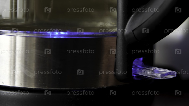 Мужской палец нажимает переключатель питания на электрическом чайнике. СМИ. Завершение процесса подогрева чистой питьевой воды в чайнице с синим светодиодным освещением