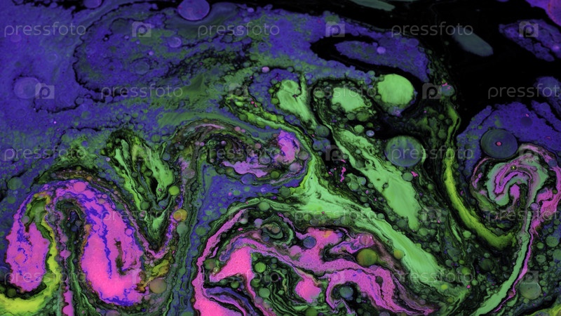 Яркое жидкое искусство с кислотными цветами и пузырями. резервные кадры. образцы смешивания жидкости ярких цветов с пузырьками на плоской поверхности. кислые красочные узоры