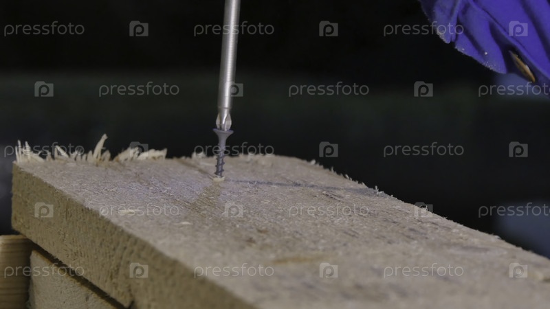Мастер просверляет отверстие. Винт затягивался электрическим сверлом. Строитель с буровой машиной. Профессиональный плотник, работающий с деревом и строительными инструментами в обрабатывающей промышленности