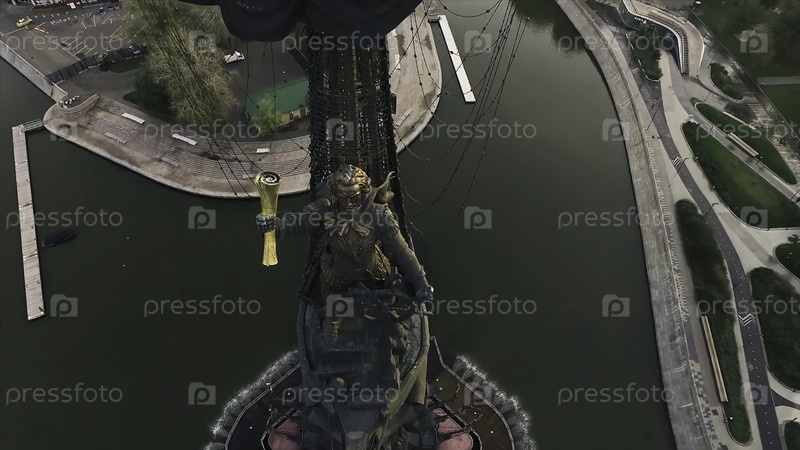 Фрагмент памятника императору Петру Великому на большом городе и яркий фон захода солнца