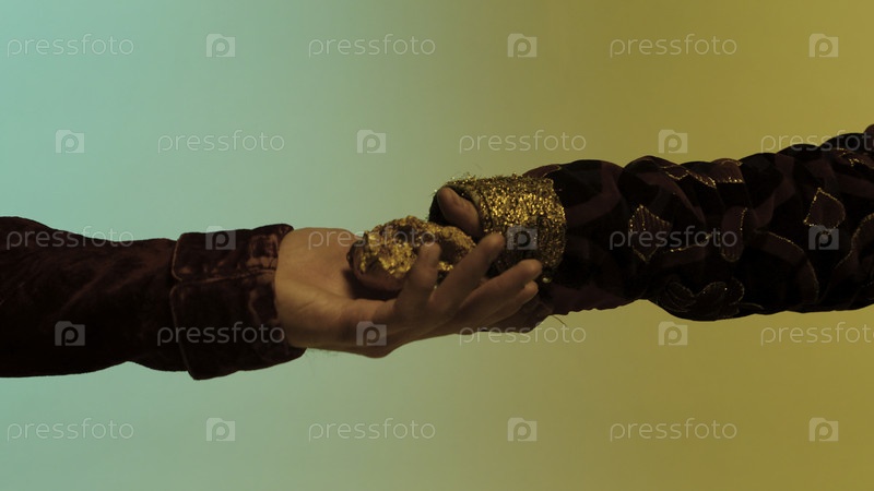 Закройте руку с восточным человеком, отдавая большой золотой кусочек другому человеку, изолированному на зеленом и желтом фоне