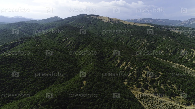 Потрясающий воздушный вид на захватывающие джунгли, Гавайи, красоту природы.Летая над зелеными лесистыми горами на фоне синего облачного неба
